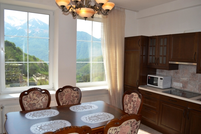 Отель «Горный хрусталь» располагается в поселке Красная Поляна, у подножия горы Ачишхо, недалеко от знаменитых Дольменов. Чтобы добраться до отеля, вам нужно доехать на автобусе или маршрутном такси до остановки «Вертодром». Потом звоните нам - мы пришлем за вами машину. Гостям отеля предлагаются двухкомнатные апартаменты квартирного типа. В каждом номере есть кухня (холодильник, микроволновая печь, варочная панель), спутниковое телевидение, санузел, душевая кабина. В отеле работает: сауна, бассейн, бильярдная. Есть собственная парковка и смотровая площадка с видом на горы. Мы организуем бесплатный трансфер утром с 7.00 до 8.00 и вечером с 19.00 до 21.00 (в остальное время 300 руб). Отель «Горный хрусталь» работает в тестовом режиме, поэтому мы предлагаем сравнительно низкие цены!